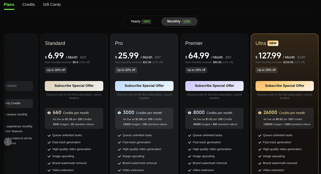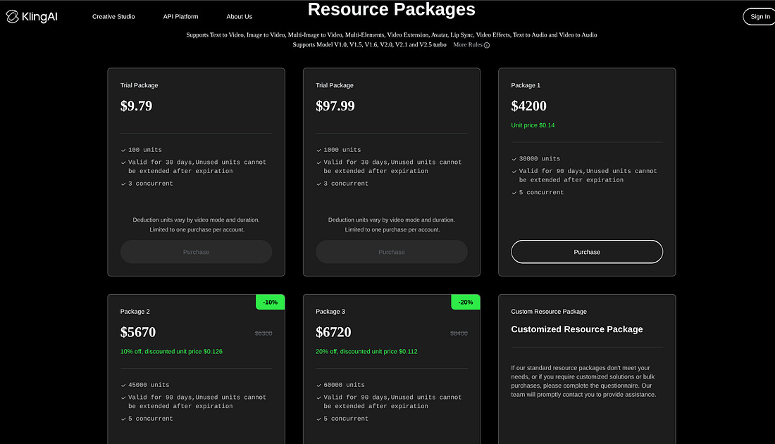Kling offers two main pricing options: a monthly subscription or the ability to purchase credits separately. API access is priced differently and will be discussed in a later section.