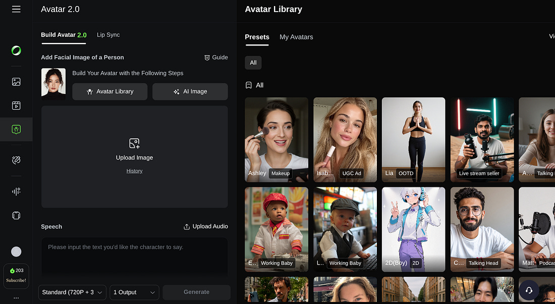 The steps are similar to Motion Control, but you need to add the speech (text) and an audio. The longer the speech, the more credits will be consumed. Instead of the text, you can also upload an audio file.