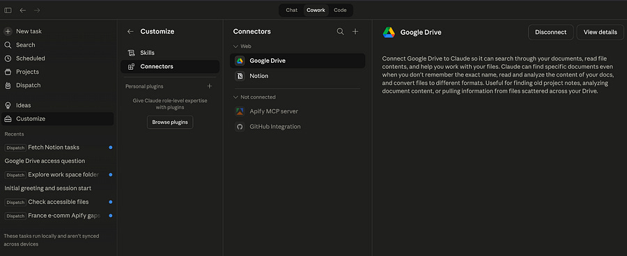Cowork is a mode in Claude Desktop that lets you set up tasks, create projects, build skills, plug your agent into multiple connectors, and define ideas. It now also provides access to the Dispatch feature, which lets you grant Claude browser access and even pair it with your smartphone.