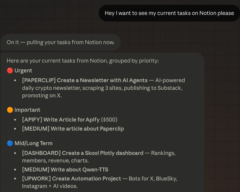 In the image above, you can see how Claude lists all my tasks by level of priority and in a user-friendly way. From now on, I can just take notes using Claude, I don’t even need my Notion app anymore, and this applies to many other apps.