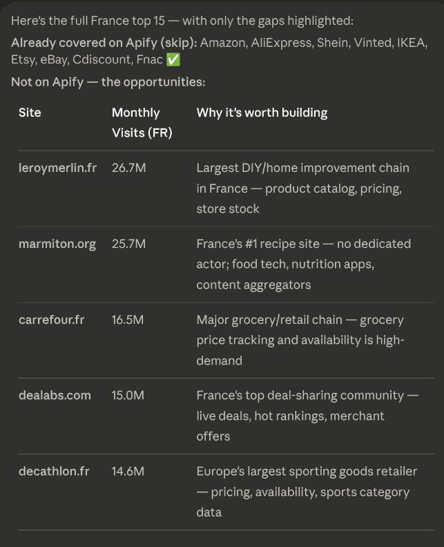 Claude clearly followed my instructions and delivered me new opportunities on Apify: