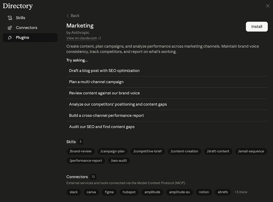 Then there are plugins, which give Claude role-specific expertise. Think of them as a library of skills and connectors tailored to a specific role, such as accounting, human resources, sales, or marketing.