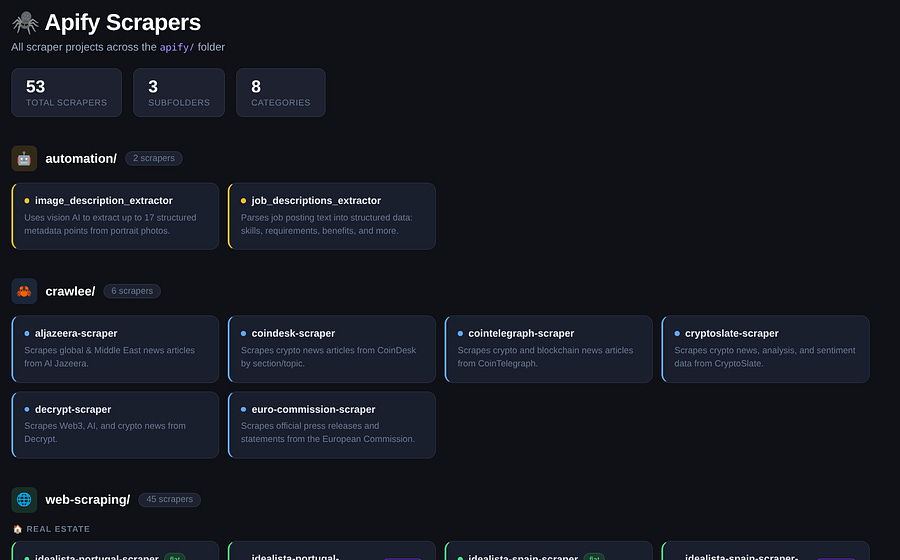 I need you to access the Apify folder and create an organized dashboard of all scrapers and automation tools I have.