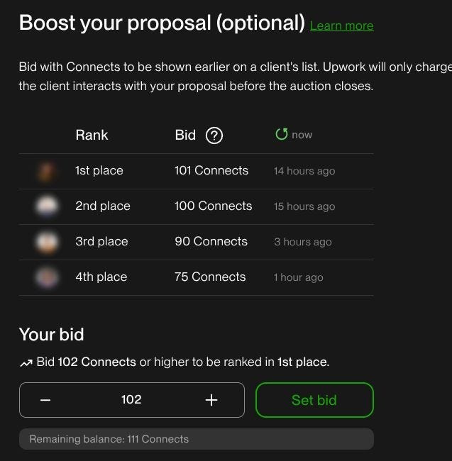 The rules of the game are simple: you bid, and if your application is seen by the client, you lose all the Connects you’ve bid for that position, hoping you’ll be the one picked.