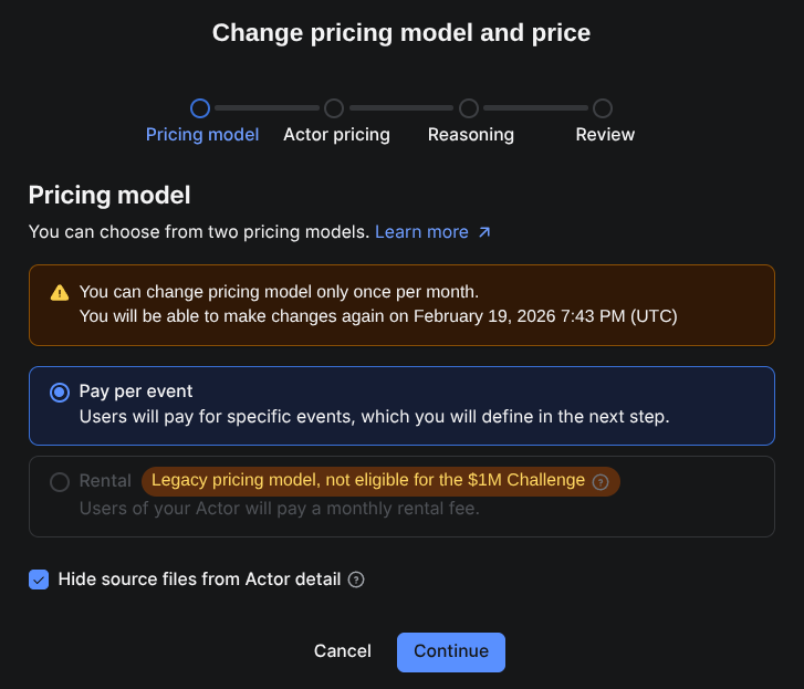To monetize your actor, there are two main options: Pay per event or Rental plan.