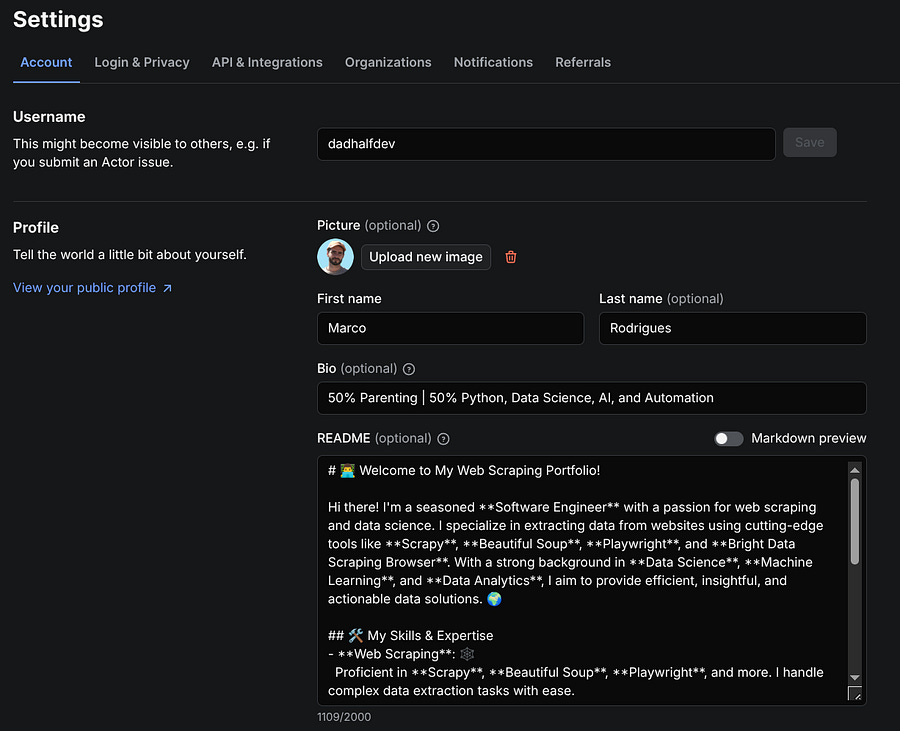 In fact, the first thing you should do is go to Settings and add some information about yourself. This helps customers who try your actors get to know you better, increasing the chances they’ll keep using your crawlers, or even reach out to you for custom ones.