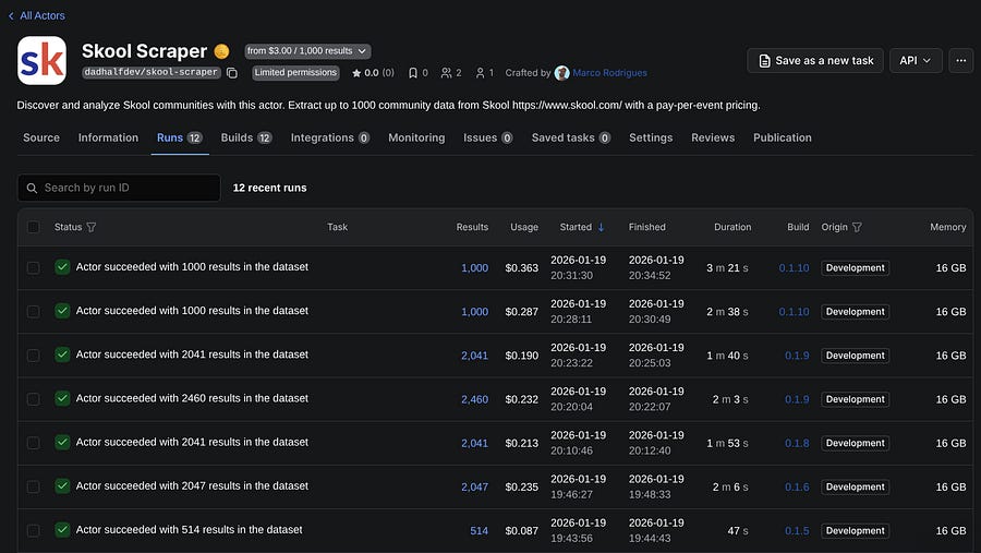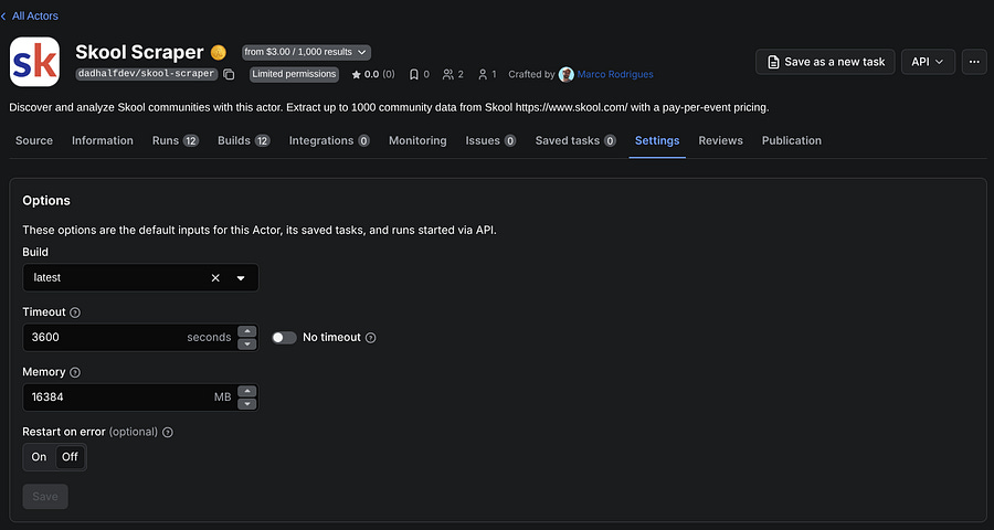 In the image above, you can see the most recent runs of my Skool Scraper, and the usage costs for each run. Align with that, you can see that I’m using a machine with 16 GB of RAM, which could be the reason driving up costs.