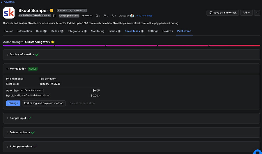 In the image above, you can see other options besides Monetization and Display information, such as Sample input and Dataset schema. These will be green if everything is ok with your actor’s health. We will have a further look into the actor’s schemas