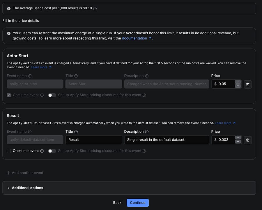 The Pay per event plan seems to be the one that Apify’s team is mostly interested in. By default, the plan has two main paid events: starting the actor and obtaining a result. You can see the result as a unity scraped.