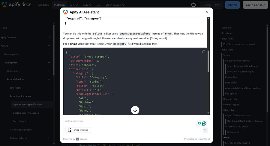 The good news is that you no longer need to spend hours digging through Apify’s documentation page to find what you need. I often use their Ask AI feature to get answers quickly. Sometimes, I even upload my code snippets and ask it to make specific modifications.