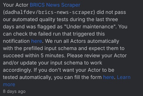 If you click here on the notification, it takes you to the log where the issue was triggered. If your actor is not fixed within 14 days, it switches to a deprecated state, and it will no longer be visible on the platform for customers. You can also set yourself the under maintenance or deprecated states.