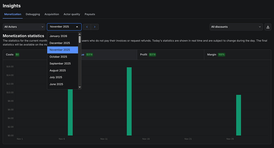 Another important tab from the console is the Insights page, where you can have a general view of your actor’s performance and how much you’re being paid for them.
