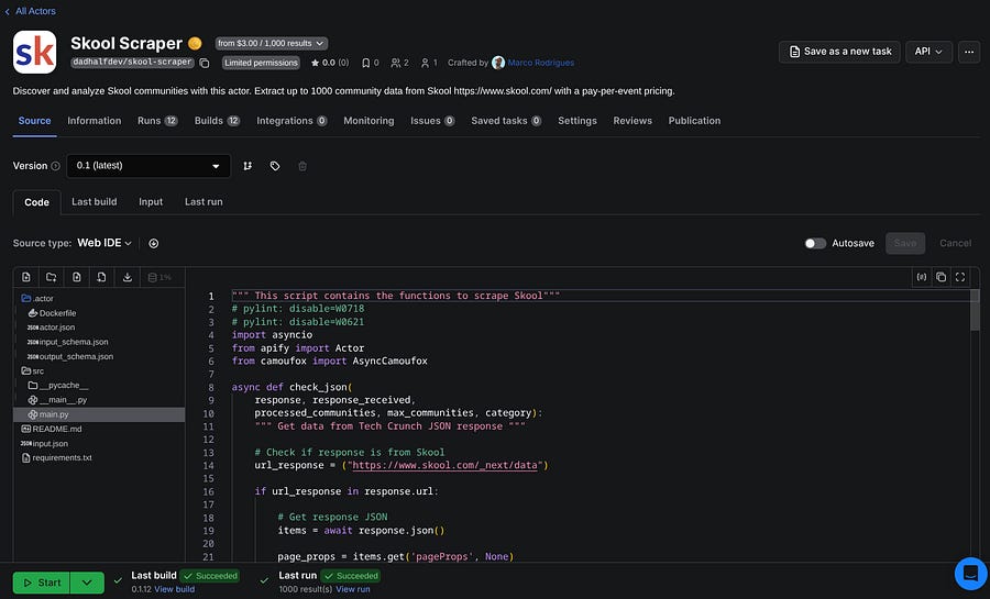 Source: Here you can test your actor, see the last run, the last build, and modify your code directly on the Web IDE.